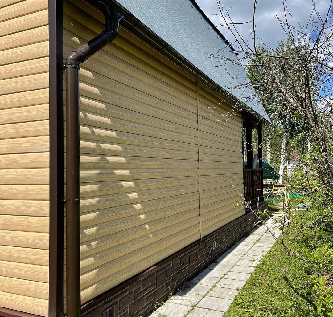 Благодаря глубокой офсетной печати по горячей поверхности панели сайдинга не тускнеют и не выгорают на солнце, сохраняя красивый натуральный тон и естественный древесный рисунок. Для облицовки фасада в единой эстетике используйте углы и профили в цвете «Яблоня».