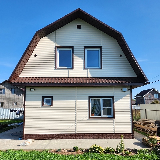 Сайдинг цвета спелого банана подходит для фасадов любой сложности и отлично показывает себя в непростых климатических условиях - не теряет насыщенности, не желтеет. Оттенок особенно красив в классических сочетаниях со светлыми аксессуарами и более темной кровлей.