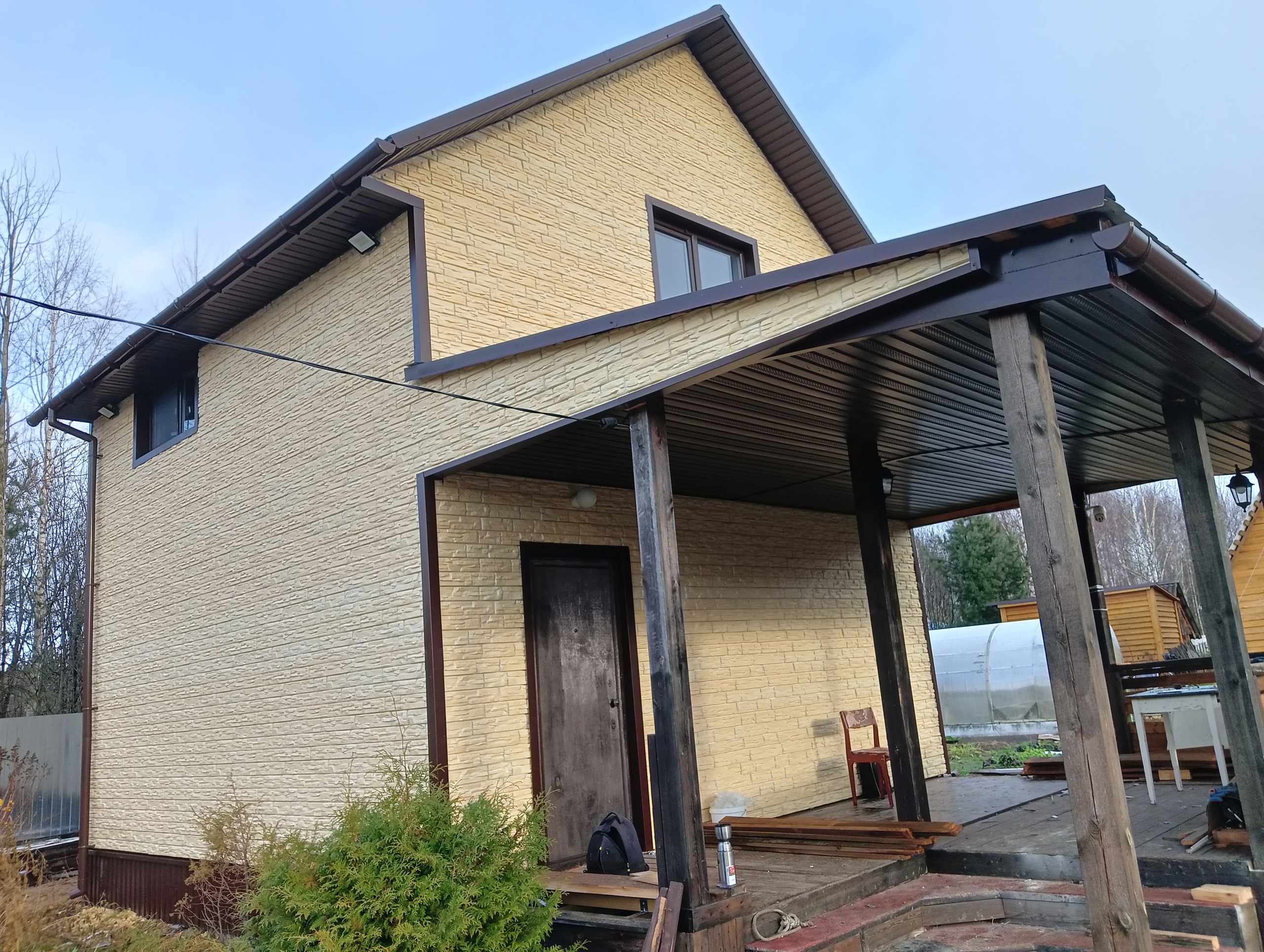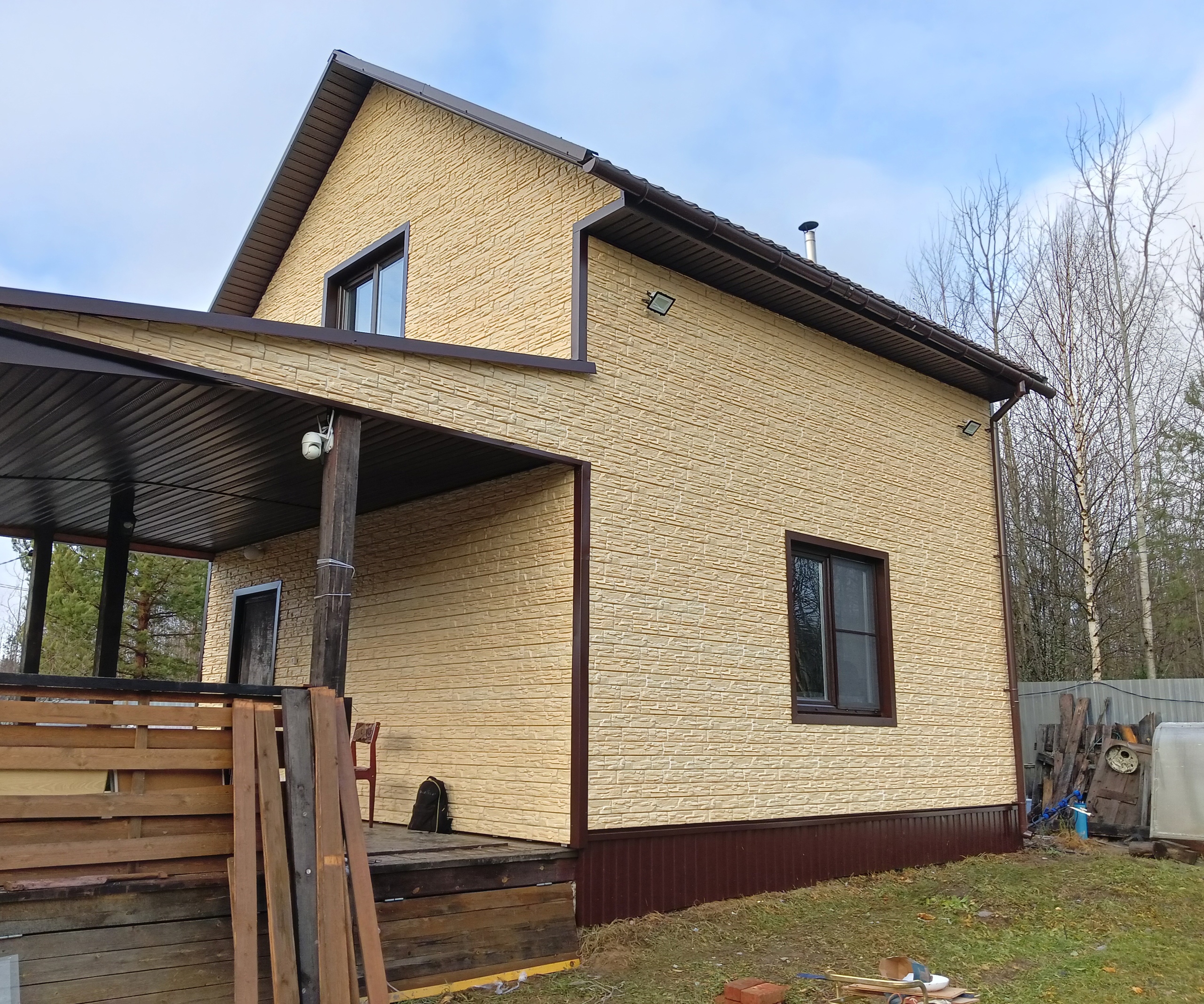 Обшили дом фиброцементными панелями. Очень довольны выбором, панели защищают от осадков и выглядят дорого, несмотря на доступную цену.